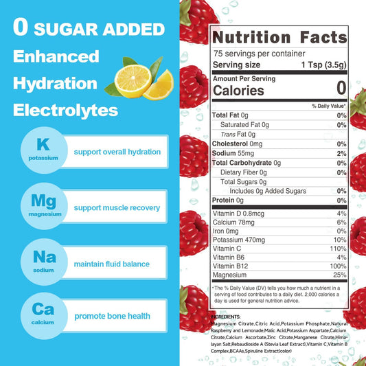 Raspberry Lemonade Electrolyte Powder Mix - Keto Friendly, Non-GMO, Enhanced with BCAAs, Vitamins, and Himalayan Salt for Energy and Muscle Function - 75 Servings