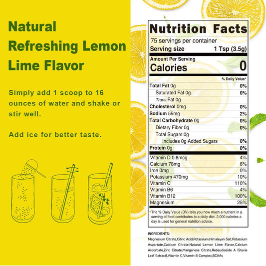 Sugar-Free Lemon Lime Electrolyte Powder with BCAAs & Vitamins - 75 Servings, Keto-Friendly & Non-GMO