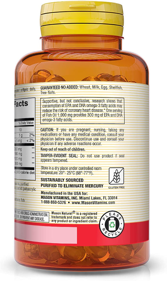 MASON NATURAL No Burp Fish Oil Softgels - 1000mg Omega-3 for Heart Health, Circulatory Support - 540 Total Softgels
