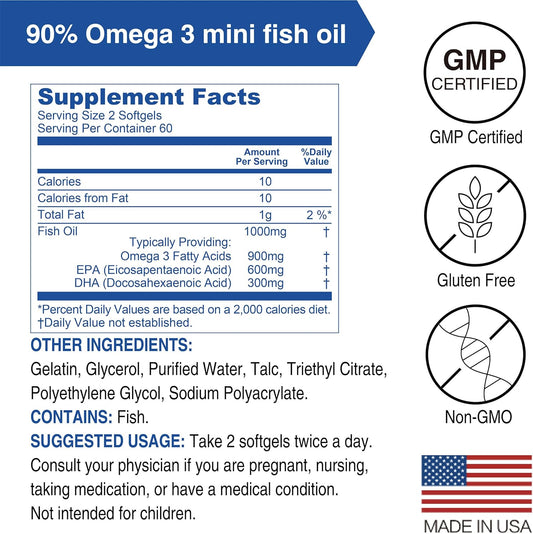 High Absorption DAIKEN rTG Omega 3 Fish Oil Softgels - 1000mg, 1200mg Burpless, Heart & Brain Support - 60 Mini Softgels