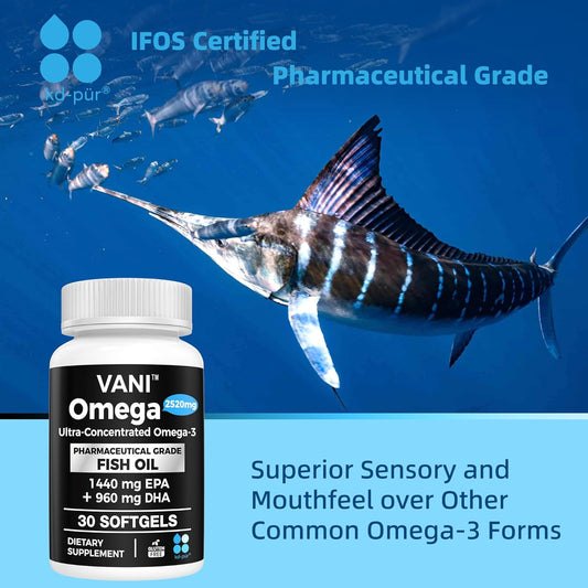 Premium VANI Pharmaceutical Grade Omega 3 Fish Oil Softgels - 2520mg EPA & DHA for Brain, Heart, & Immunity - Made in Germany (30 Count)