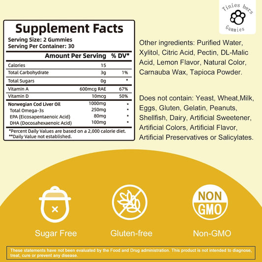 Sugar-Free Tinies Cod Liver Oil Gummies 1000mg, Omega-3 & Vitamin A&D for Brain, Heart, Eye, Bone Health - 60 Count