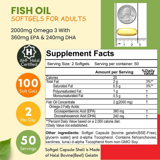 High Strength Halal Fish Oil Softgels - 2000mg with 360mg EPA & 240mg DHA - 100 Non-GMO Omega 3 Softgels for Heart & Brain Health - Burpless & Easy-to-Swallow Omega 3 Supplements