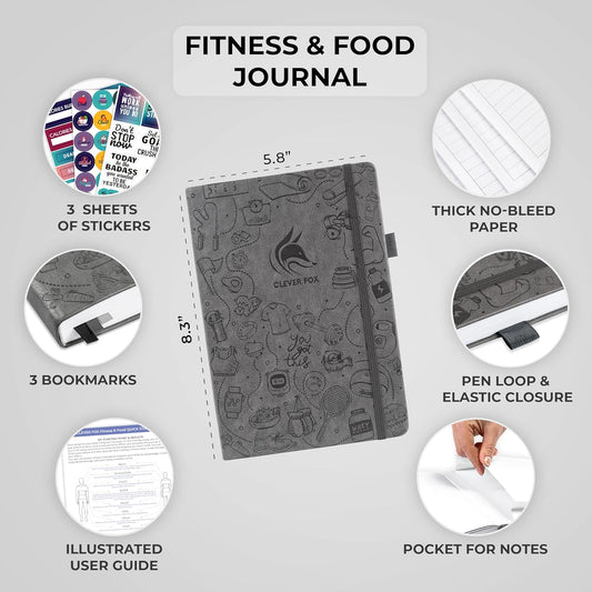 Undated Nutrition & Workout Planner for Women & Men - Clever Fox Fitness Journal - Diet & Gym Exercise Log Book - A5 Size, Hardcover - Grey