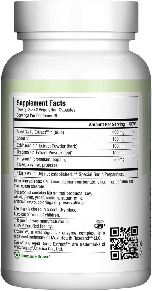 180 Count Maxi Health Maxi Biotic Aged Garlic Extract Capsules with Spirulina, Echinacea, Oregano, Enzymax - Natural Antioxidant & Wellness Support Supplement