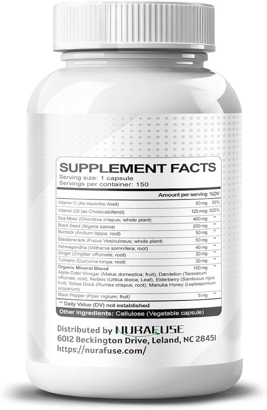 16-in-1 NURAFUSE Sea Moss Black Seed Oil Ashwagandha Ginger Formula with Burdock, Bladderwrack, Turmeric - Non-GMO, Gluten-Free, Soy-Free