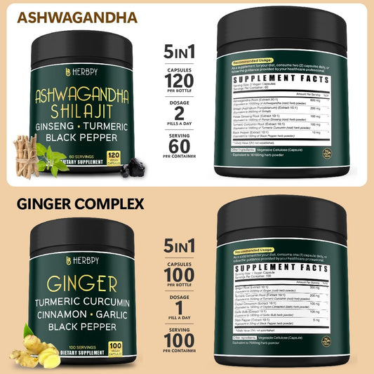 5-in-1 Herbpy Bundle with Ashwagandha, Shilajit, and Ginger Supplements for Heart, Digestion, and Immune Support