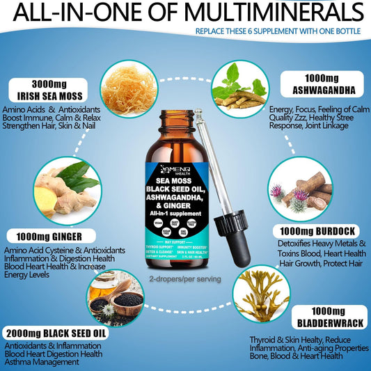Premium Vegan Sea Moss Black Seed Oil Ashwagandha Ginger Liquid Drops Extract - Immunity & Joint Support - 4X Stronger - 3000mg