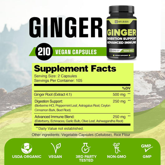11-in-1 Ginger Supplement Capsules with Berberine HCl, Elderberry, Echinacea - Support Digestion, Joints, Immune System, Heart - 210 Pills