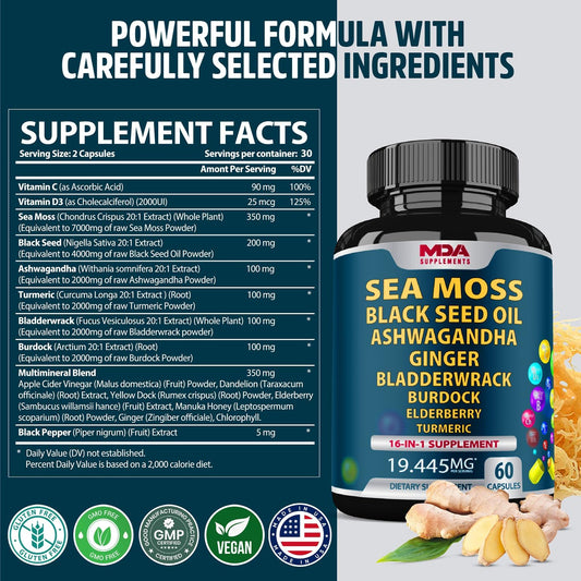 Organic Sea Moss Capsules with Black Seed Oil, Ashwagandha, Ginger, Burdock Root & Bladderwrack - 60 Pills