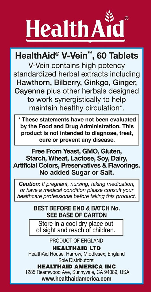 V-Vein by HealthAid: Support Healthy Circulation in Legs and Feet with Ginkgo, Grape Seed, Vitamin C, and Bilberry - 60ct Vegan Capsules