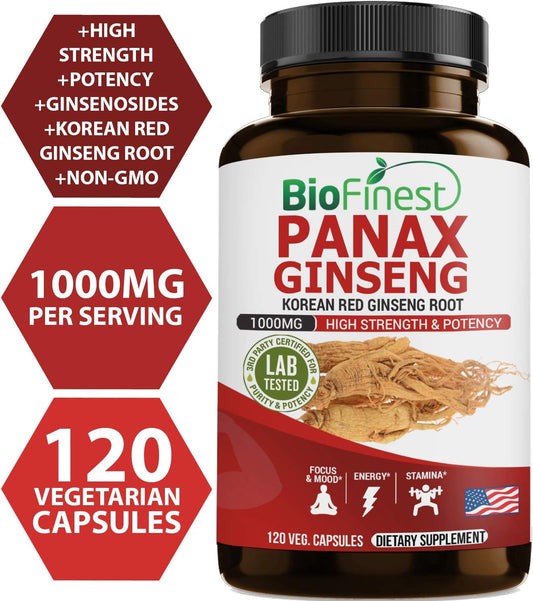 Premium BioFinest Korean Panax Ginseng Supplement - 1000mg Red Ginseng Root with 5% Ginsenosides for Enhanced Focus, Energy, Stamina, Memory, and Immune Support - 120 Capsules for Men and Women