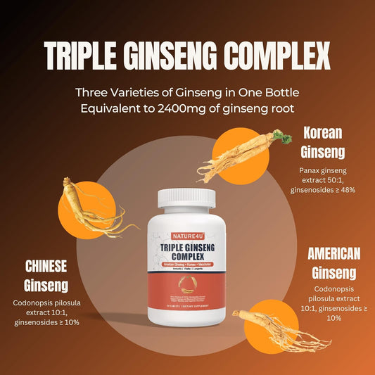 Triple Ginseng Complex with 15% Ginsenosides for Energy, Memory, Vitality, Immune Support, and Healthy Aging - 30 Tablets
