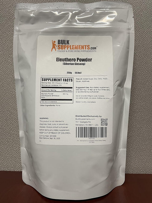 BulkSupplements.com Siberian Ginseng Powder - Eleutherococcus senticosus Herbal Supplement, Gluten Free, 500mg per Serving, 250g (8.8 oz) (1 Pack)