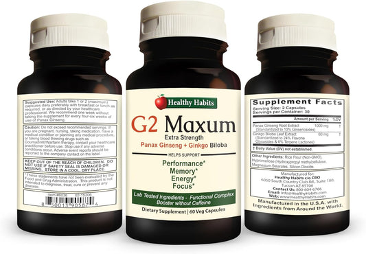 Energy & Cognitive Function Support: G2 Maxum Panax Ginseng + Ginkgo Biloba Capsules - 60 Veg Capsules