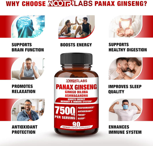 7500mg Korean Red Panax Ginseng with Ginkgo Biloba and Ashwagandha - Energy, Memory, Immune Support - 90 Vegan Capsules - Men and Women Focus Supplement