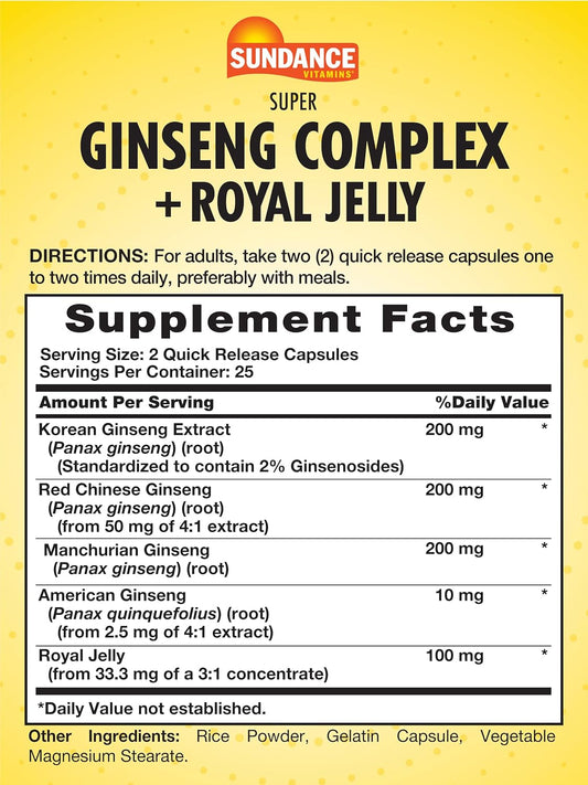 Non-GMO Sundance Super Ginseng Complex with Royal Jelly | 50 Quick Release Capsules | Gluten Free Herb Supplement