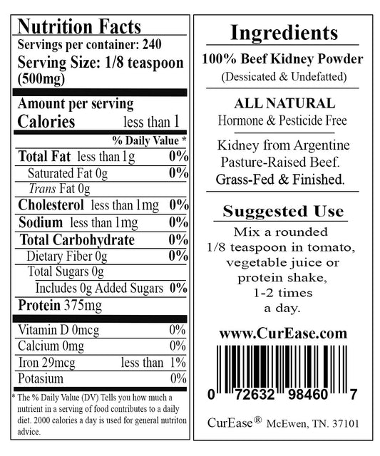 Grass Fed Argentine Beef Kidney Powder - 4.2 oz, 240 Servings - CurEase