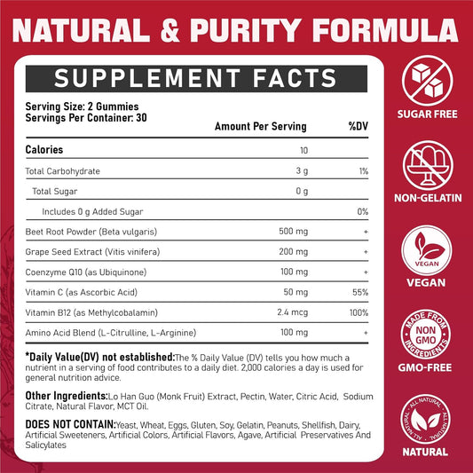 500mg Beet Root Gummies with CoQ10, Grape Seed & Vitamin C - Sugar Free Antioxidant & Energy Support for Men & Women