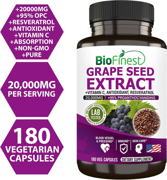 High Potency BioFinest Grape Seed Extract 20000mg - 95% Polyphenols, OPC, Vitamin C, Resveratrol - Antioxidant for Skin, Beauty, Collagen, Immune Support - 180 Veg Capsules