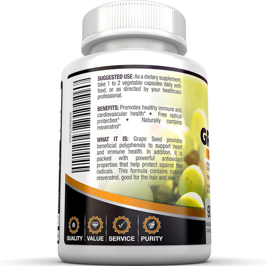 Maximum Strength 95% Proanthocyanidins Grapeseed Extract Capsules - Immune System Booster & Antioxidant for Heart, Brain, Bone & Skin - 90 Veggie Caps