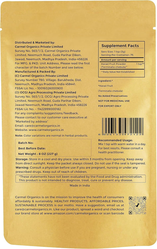 8oz Organic Harad/Haritaki Fruit Powder - Non-GMO, Preservative-Free Terminalia Chebula Powder - 1 Pack - 227g