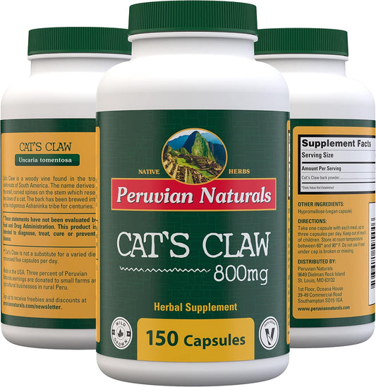 Peruvian Naturals Cat's Claw 800mg Capsules - Vegan Cats Claw Bark from Peru - 150 Ct. | Corteza UNA de Gato - 100% Natural