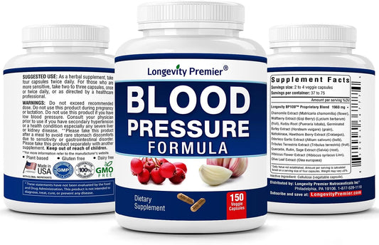 Longevity Blood Pressure Formula Value Pack - 3 Bottles + Free CoQ10 - 150 caps each - 30 Veggie caps