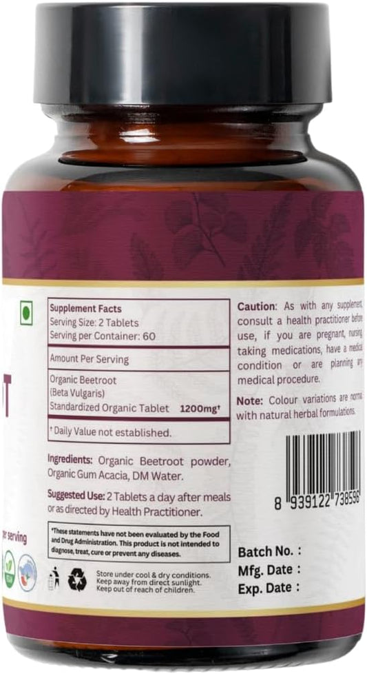 USDA Certified Organic Beetroot Tablets - 120 Count | Supports Blood Flow & Energy | Vegan Formula | Beta Vulgaris Supplement