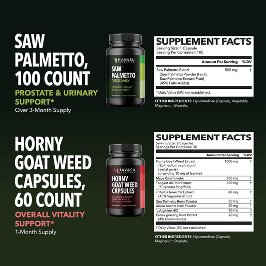 Men's Prostate Health and Performance Herbal Supplement Bundle - Saw Palmetto and Horny Goat Weed Capsules for Vitality - 100 Saw Palmetto & 60 Horny Goat Weed Capsules