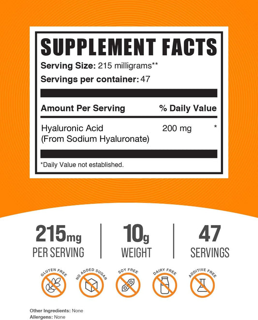BulkSupplements.com Hyaluronic Acid Powder - 215mg per Serving, Food Grade, Gluten Free - Hyaluronic Acid Supplement Powder - 10g (0.35 oz) Pack of 1