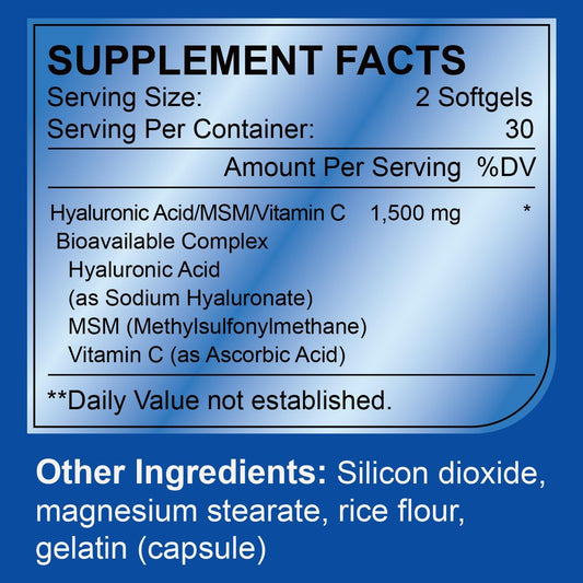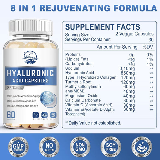 850mg Hyaluronic Acid Supplements for Joint Lubrication, Skin Hydration, Hair & Nails - 60 Softgels