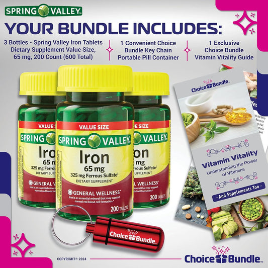 Bundle Deal: Spring Valley Iron Tablets Value Size 65 mg 200 CT x3 + Vitamin Vitality Guide & Pill Container - 600 Total Items