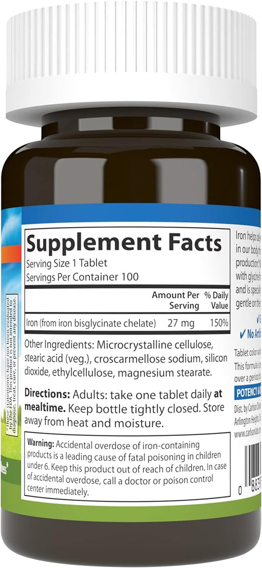 Carlson Chelated Iron 27mg Tablets for Blood Health & Energy - Superior Absorption for Wellness
