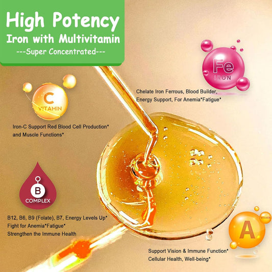 Liquid Iron Supplement with Vitamin C, B12, and B-Complex for Anemia and Fatigue - Vegan Iron Drops for Women, Men, and Kids - High Potency Blood Builder Iron Formula