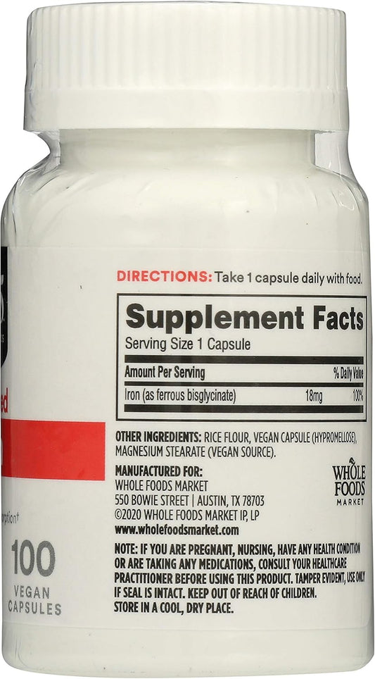 Whole Foods Market 365 Iron Chelated 18mg, 100 Veg Capsules x2 Pack, High Absorption Formula