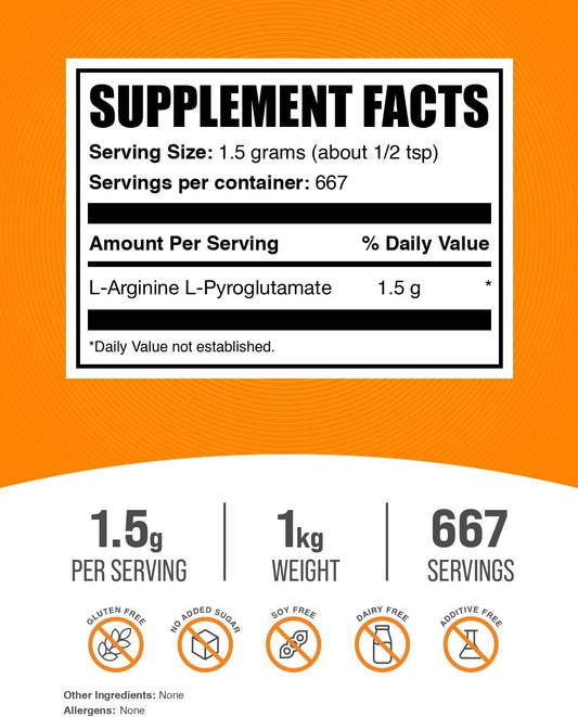 BulkSupplements.com L-Arginine L-Pyroglutamate Powder - Nitric Oxide Booster - Gluten Free, 1500mg per Serving, 1kg (2.2 lbs)
