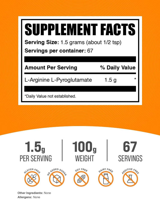 BulkSupplements.com L-Arginine L-Pyroglutamate Powder - Nitric Oxide Boost, Gluten Free, 1500mg per Serving, 100g (3.5 oz) Pack of 1
