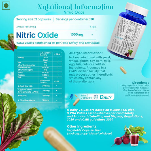 Organic Nitric Oxide Booster Capsules with L-Arginine & Beetroot for Men & Women - Promotes Blood Flow & Pre-Workout Muscle Pump - 60 Vegan Capsules