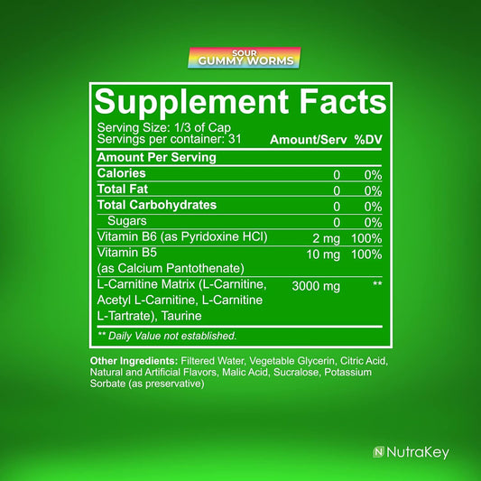 NutraKey L-Carnitine 3000mg Sour Gummy Worms - Sugar & Gluten Free Energy Booster, 31 Servings