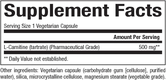 Bluebonnet Nutrition L-Carnitine 500mg Capsules - Fatty Acid Transport, Cellular Energy Boost - Soy-Free, Gluten-Free, Non-GMO, Kosher, Vegan - 30 Servings