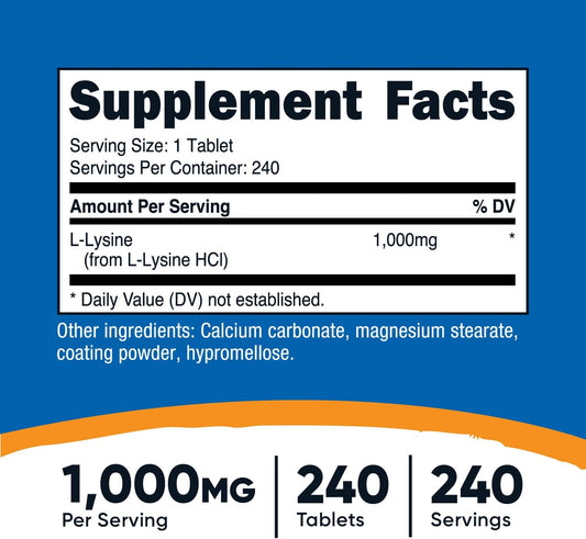 Nutricost L-Lysine 1000mg Tablets - 240 Count, Gluten-Free, Non-GMO, Vegetarian-Friendly