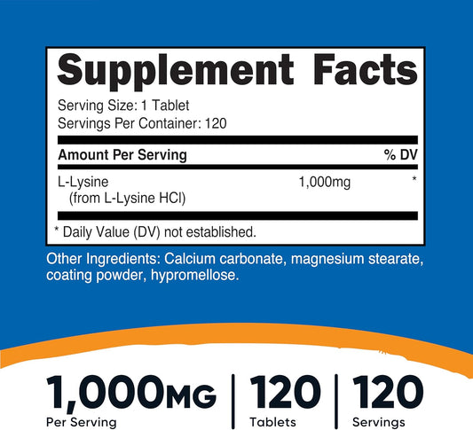 Nutricost L-Lysine 1000mg Tablets - Gluten Free, Non-GMO, Vegetarian-Friendly - 120 Count