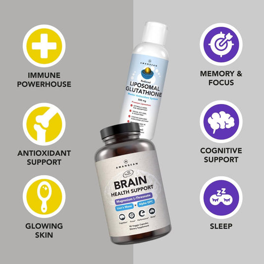 Bundle: AMANDEAN Premium Brain Health Supplement with Liposomal Glutathione - Triple Formula for Cognitive Support and Focus