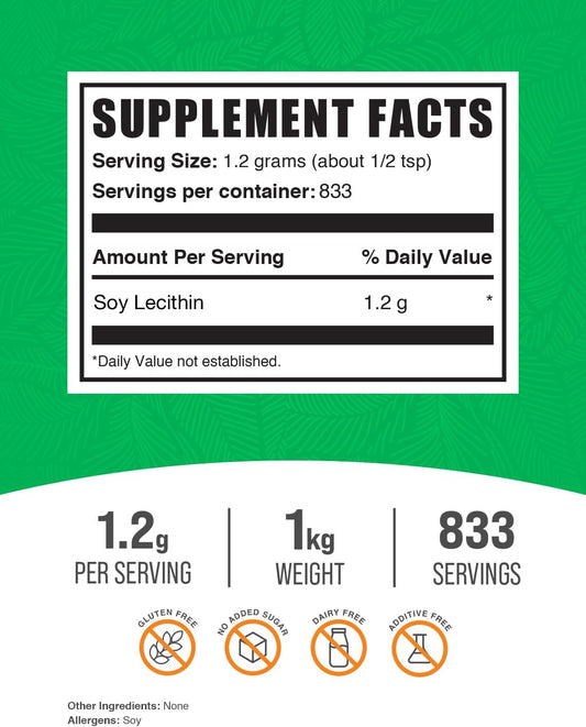 High-Quality Soy Lecithin Powder Supplement - Food Grade, Gluten-Free, 1200mg per Serving - 1kg (2.2 lbs) Pack of 1 - BulkSupplements.com