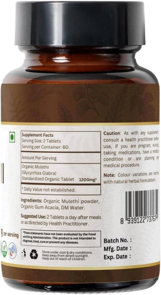 USDA Certified Organic Licorice Mulethi Tablets - 120 Vegan Tabs for Healthy Digestion - Glycyrrhiza Glabra Supplement