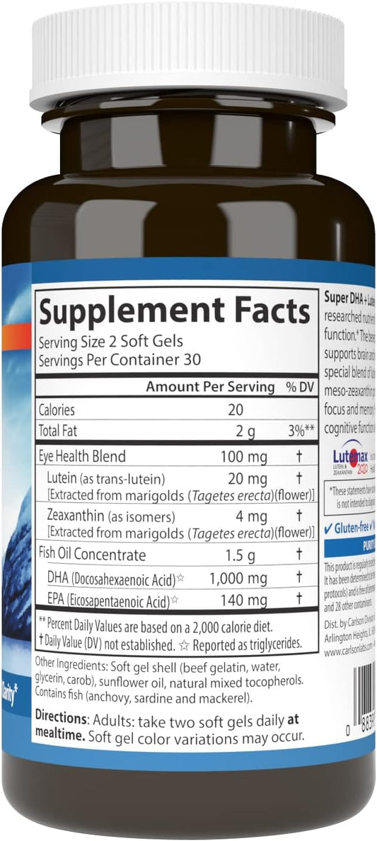 Carlson Super DHA Plus Lutein Softgels - 1000mg DHA + 20mg Lutein - 60 Count
