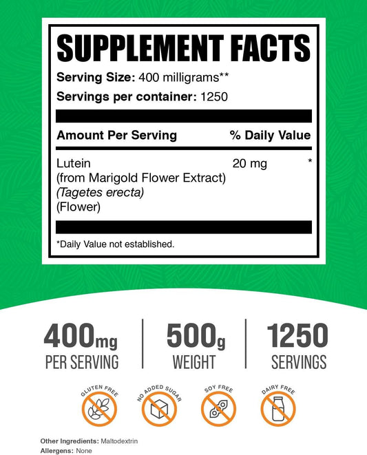 Lutein Powder Supplement - Marigold Flower Extract, 20mg Lutein per Serving, Antioxidant, Gluten Free, 500g (1.1 lbs)