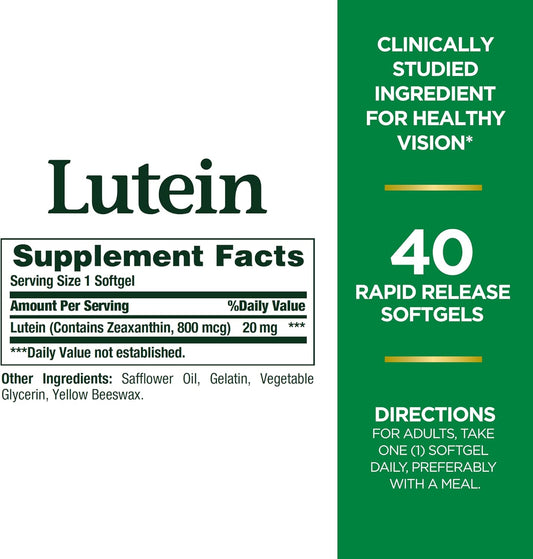 Lutein Supplement 20mg - 40 Softgels for Eye Health and Antioxidant Support