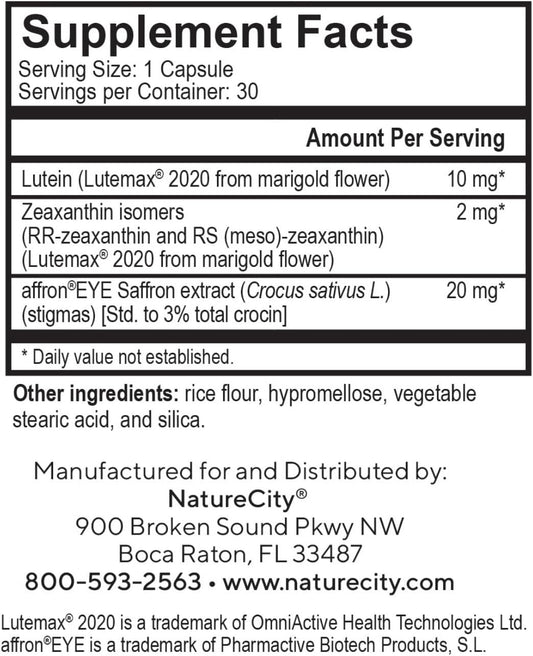 Plant-Based Eye Health Supplement with Lutein, Zeaxanthin, and Saffron - Supports Central and Night Vision, Blue Light Protection - 60 Veggie Capsules